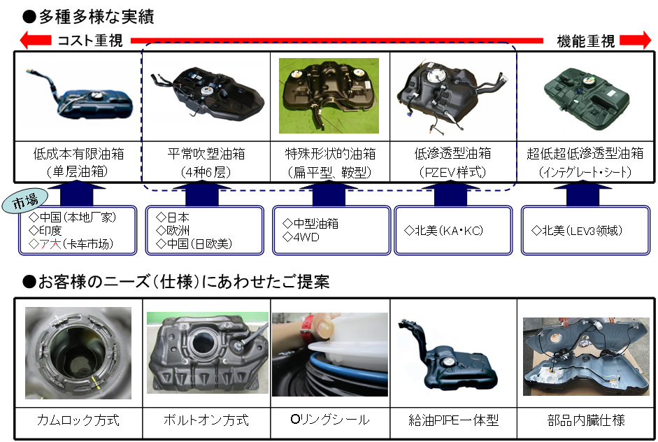 以塑料燃油为主打产品的八,最先为对应 PZEV 法规(美国加利福尼亚州大气资源局CARB制定的Partial-Credit Zero Emission Vehicle排放法规)而进行燃油箱的产品化,并可独立的解决材料的配比以及油箱原材料的开发,最科实现批量生产。