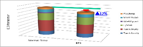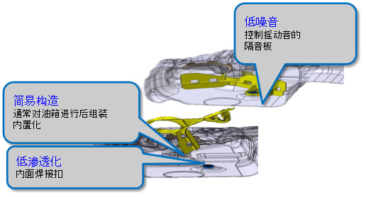 为对应北美的HC渗透的LEVⅢ法规,将构成零件进行内置燃油箱内,从而开发的低渗透燃油箱。并且,低公害 高燃油性汽车由于配置了怠速停止功能,会引起油箱内的燃油摇动音的发生,为提高控制摇动音,在油箱内嵌入了隔音板,从面实现了轻量化技术同步开发的同时,也将燃油系统更进一步提高。
