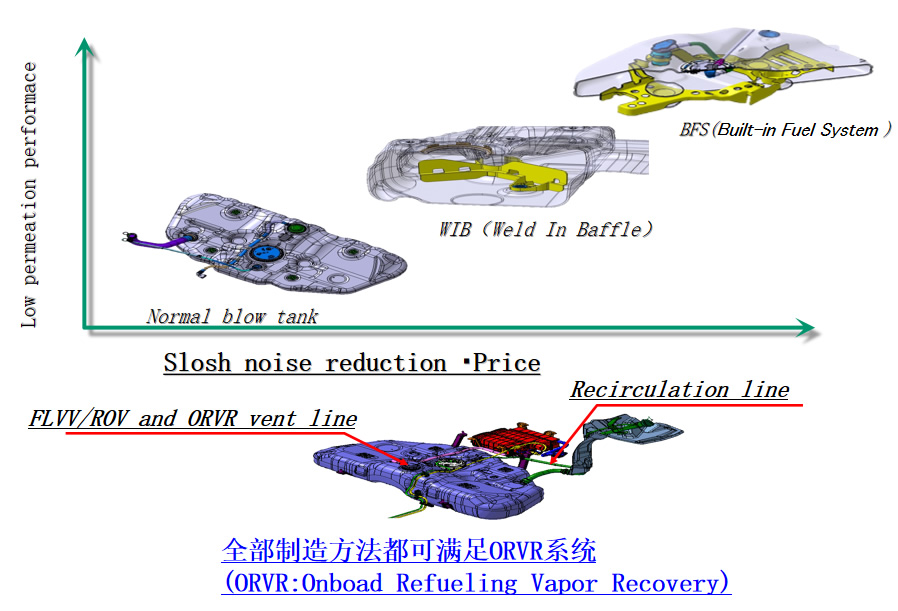 为对应北美的HC渗透的LEVⅢ法规,将构成零件进行内置燃油箱内,从而开发的低渗透燃油箱。并且,低公害・高燃油性汽车由于配置了怠速停止功能,会引起油箱内的燃油摇动音的发生,为提高控制摇动音,在油箱内嵌入了隔音板,从面实现了轻量化技术同步开发的同时,也将燃油系统更进一步提高。
